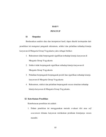 (2)Seleksi berpengaruh positif dan tidak signifikan terhadap Kinerja Karyawan, (3) Pelatihan berpengaruh positif dan signifikan terhadap Kinerja Karyawan, (4) Rekrutmrn, Seleksi, dan Pelatihan berpengaruh secara simultan terhadap Kinerja Karyawan.